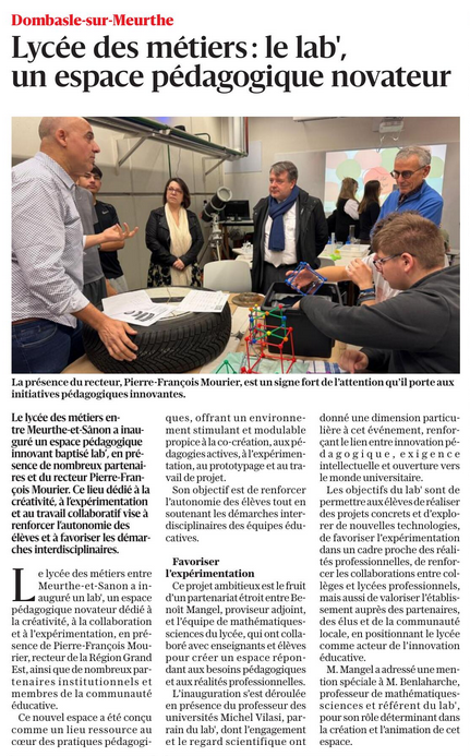 Le lycée des métiers entre Meurthe-et-Sanon a inauguré un lab’, un espace pédagogique novateur dédié à la créativité, à la collaboration et à l’expérimentation, en présence de Pierre-François Mourier, recteur de la Région Grand Est, ainsi que de nombreux partenaires institutionnels et membres de la communauté éducative.