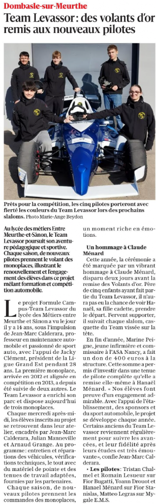 Le projet Formule Campus-Team Levassor du lycée des Métiers entre Meurthe et Sânon a vu le jour il y a 14 ans, sous l’impulsion de Jean-Marc Calderara, professeur en maintenance automobile et passionné de sport auto, avec l’appui de Jacky Clément, président de la Ligue Grand Est pendant 28 ans. La première monoplace, arrivée en 2012 et alignée en compétition en 2013, a depuis été suivie de deux autres. Le Team Levassor a enrichi son parc et dispose aujourd’hui de trois monoplaces.